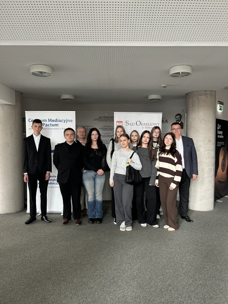 W czwartek 16 października 2025 r. dziewięcioro uczniów naszej szkoły oraz dwoje opiekunów uczestniczyło w wydarzeniu pt. „Duch Mediacji w Operze”. Jego organizatorem był Sąd Okręgowy w Białymstoku i Centrum Mediacyjne Pactum przy Wydziale Prawa Uniwersytetu w Białymstoku we współpracy z Podlaskim Kuratorem Oświaty. Celem wydarzenia była popularyzacja wiedzy nt. polubownych metod rozwiązywania sporów, a w szczególności wdrażania mediacji jako alternatywnej drogi ich rozwiązywania przy wykorzystaniu nowoczesnej kadry specjalistów w dziedzinie mediacji – mediatorów działających w różnych obszarach przestrzeni publicznej: szkoły, podmioty sektora finansów publicznych (w tym w szczególności jednostki samorządu terytorialnego), przedsiębiorcy. Wydarzenie odbyło się w budynku Opery i Filharmonii Podlaskiej Europejskie Centrum Sztuki w Białymstoku imienia Stanisława Moniuszki przy ul. Odeskiej 1.