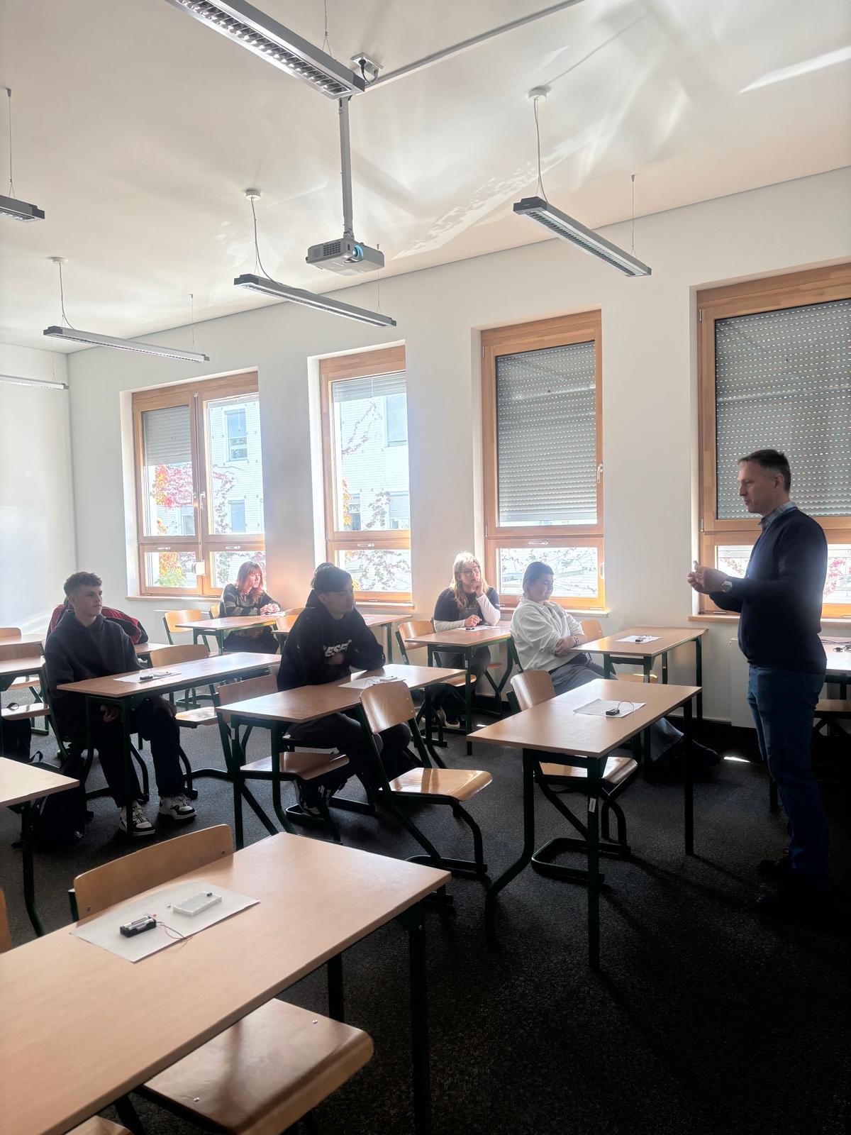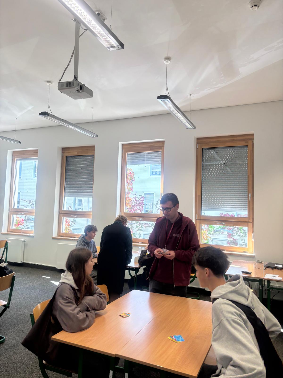 Podczas spotkania, które zostało zorganizowane indywidualnie dla naszych klas, uczniowie uczestniczyli w wykładzie "Wstęp do projektowania gier w Unity" trwającym 45 minut oraz w zajęciach interaktywnych, które miały formę „naukowego escape roomu”. Młodsze grupy miały okazję rozwiązywać łamigłówki, grać w gry retro, pracować z mikrokontrolerami oraz zgłębiać techniki efektywnego promptingu. Zajęcia w mniejszych grupach trwały około 2 godzin, co umożliwiło aktywne zaangażowanie wszystkich uczestników.