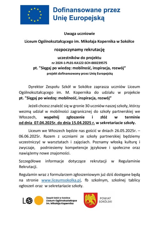 30 osobowa grupa uczniów Liceum Ogólnokształcącego im. M. Kopernika w Zespole Szkół w Sokółce wraz z opiekunami, w maju wyjedzie na 14- dniową mobilność edukacyjną do Włoch